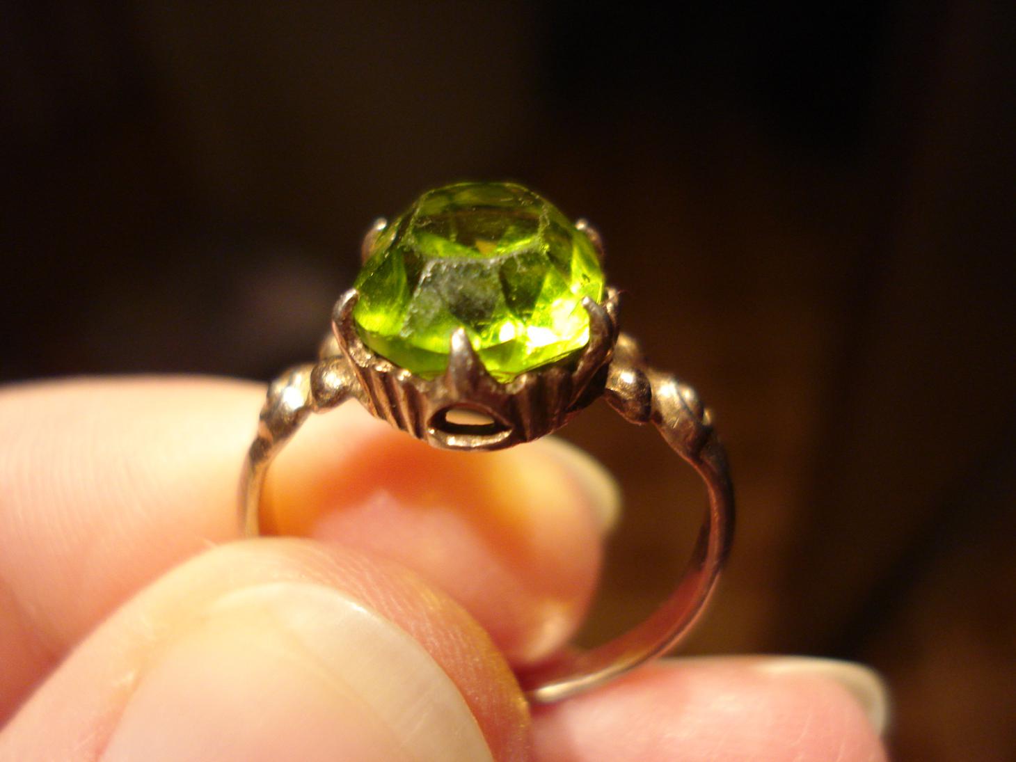 Вот еще вспомнила... один мой знакомый говорил, что обычно стекляшки в украшениях покрывали с тыльной стороны амальгамой (чтобы блестели лучше?), а вот настоящие камни не "красят"... мне кажется, на фото камень (который показался нам похожим на хризолит) без покрытия?