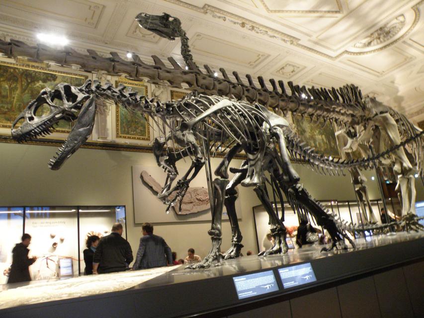10. Скелеты (кажется, небольшой тиранозавр, а на заднем плане диплодок со "спины").