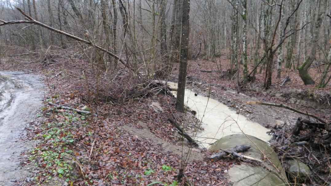 После брода через реку дорога начала медленно подниматься вверх. Слева и справа вдоль дороги текли ручьи с мутной водой — результат дождя и размыва пород вверху на карьере. В ручьях стали попадаться куски белого кварца разной формы и размеров. Интересно то, что в советские времена даже такую горную дорогу проложили на совесть. Периодически под дорогой встречаются бетонные трубы-водоотводы, и ручьи не размывают дорогу. Идти одно удовольствие, по сравнению с другими местами в горах, где сам чёрт ногу сломит. Дорога хорошо укатана и не разбита лесовозами, как другие дороги в горах... Хорошим шагом от брода до рудника — час с небольшим хода. Местную воду лучше не пить: все эти ручейки несутся сверху из карьера, где происходит размыв содержащей ртуть осадочной алевритовой породы.