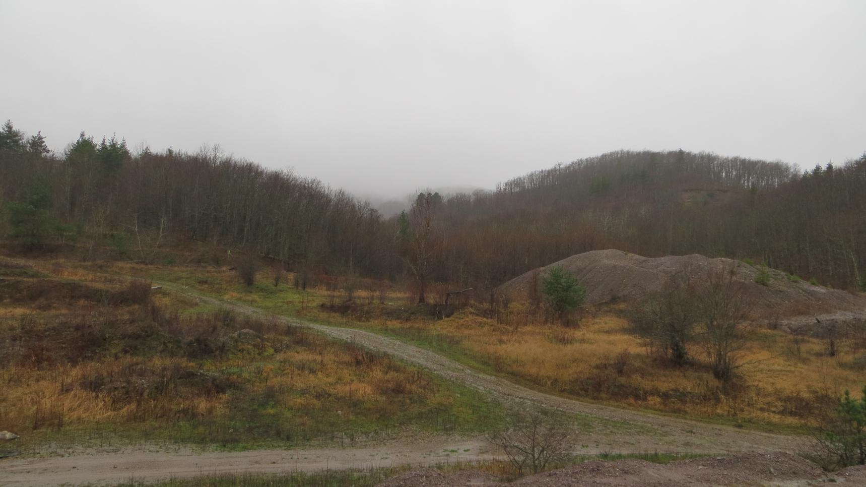 Медленно, но уверенно дорога поднималась вверх, и уже в начале пятого мы увидели первые отвалы отработанной породы из штолен. Вышли на открытое пространство. Подобную местность на картах часто обозначают как "урочище". Слева и справа от дороги виднелись кучи породы. Немного впереди — открытая площадка, на которой слева сохранились остатки зданий рудника. Это главный ориентир и место, от которого можно делать радиальные экскурсии в разные части месторождения.
