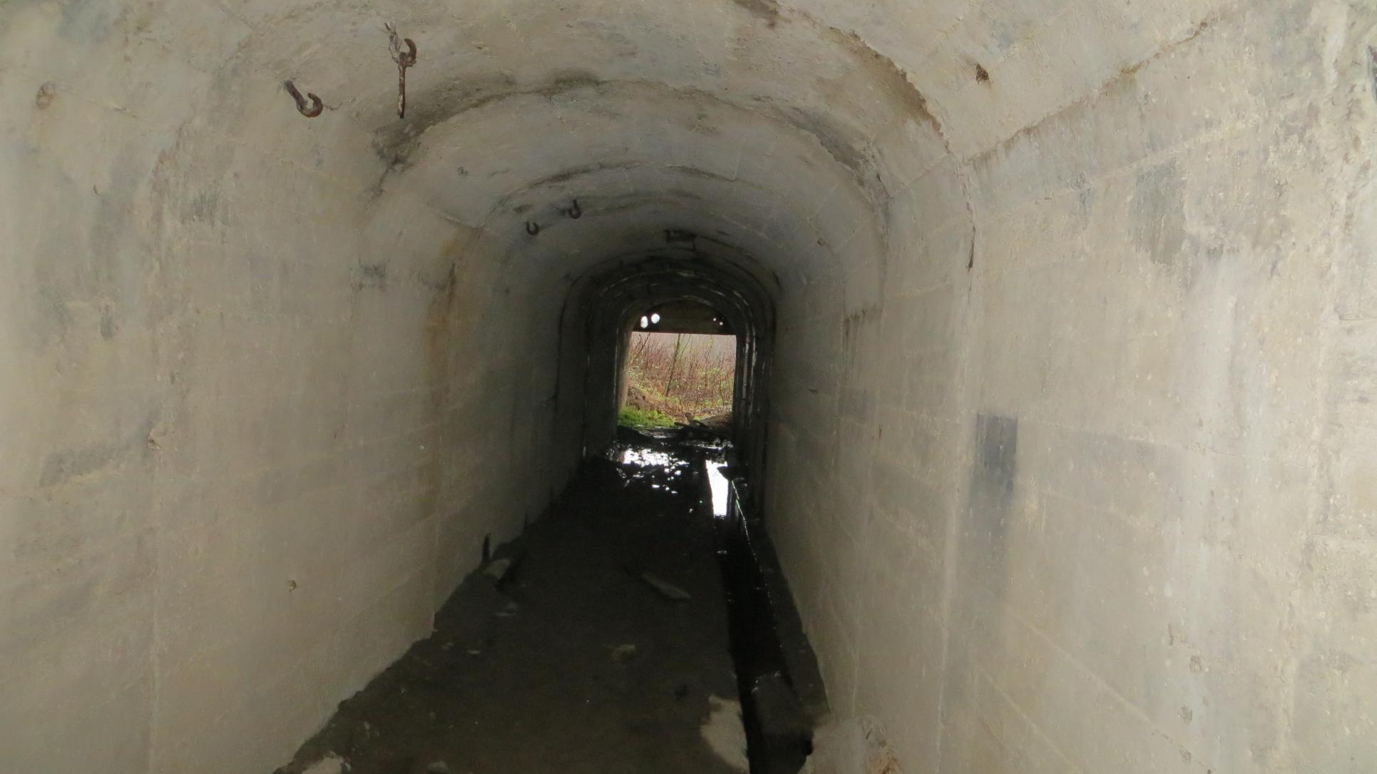 Оставив слева позади остатки управления рудника, мы начали внимательно осматривать правую сторону горы. Где-то должен быть вход в штольню. Эта первая штольня. Там их должно быть несколько. И вот нашли... Это коридор из монолитного бетона, ведущий вглубь горы. Пол глинистый, мокрый, но пройти можно. Включили фонарики. Прошли по тоннелю метров 50-70, далее он раздваивается на две ветки, каждая из которых чуть дальше затоплена водой. Нужно приходить в тёплое время и с резиновыми сапогами.
