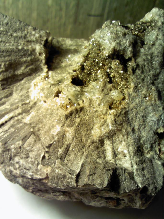 Вероятно, кристаллы начали расти уже на поверхности сформированной конкреции или, наоборот, крупные кристаллы начали обрастать мелкокристаллической массой.