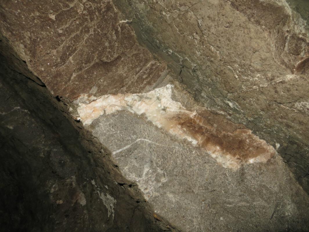 Кальцитовые жилы и другие образования на стенах штольни (фото 3, 4, 5, 6).
