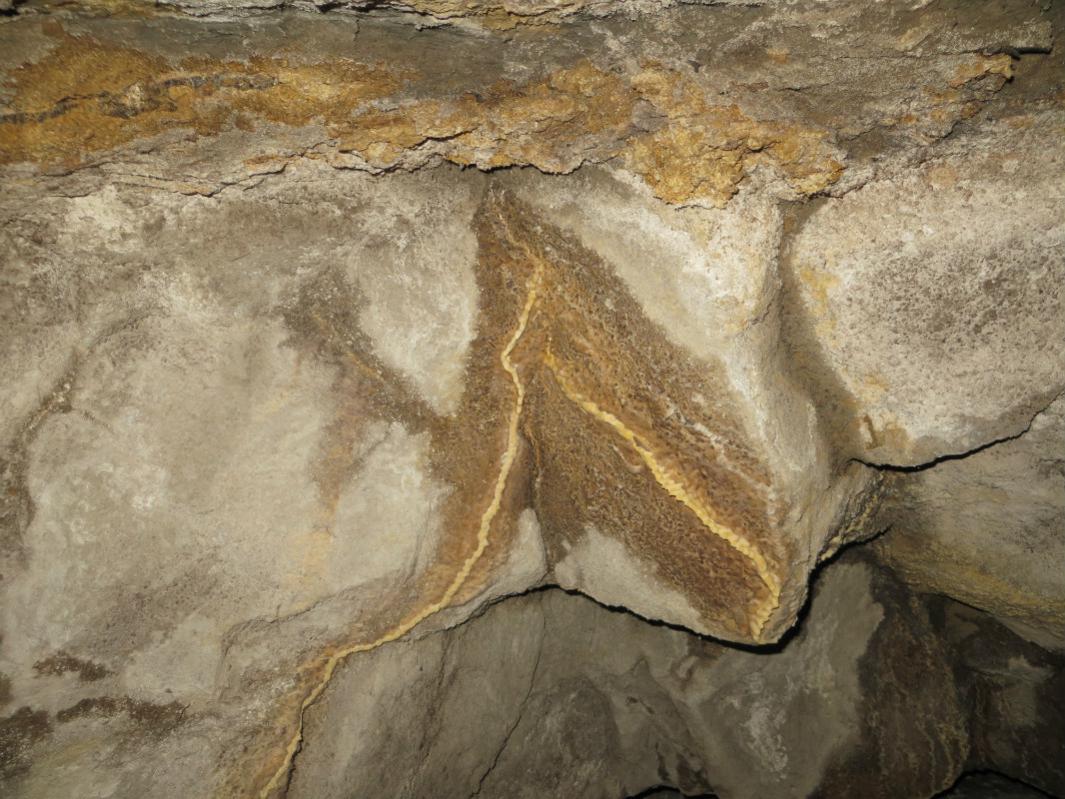 Небольшая жилка-прослой гагата на потолке (фото 5). Отковырял кусочек, подпалил зажигалкой — толком не горит, но запах, как от битума или пластика.