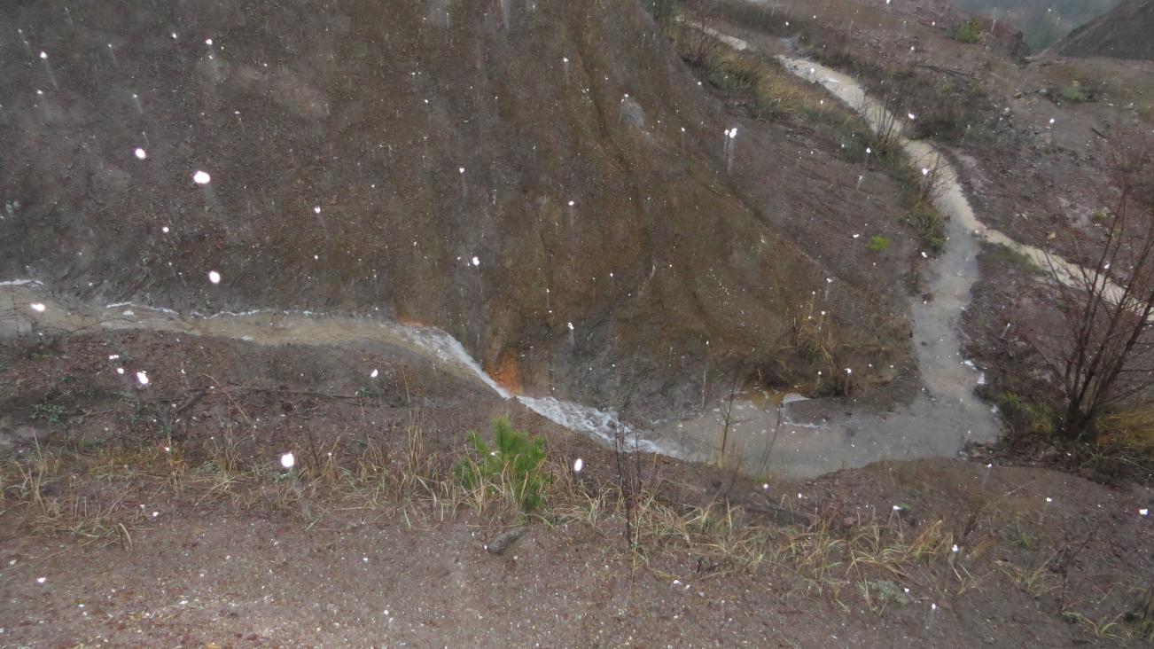 Накапливающаяся после дождя вода собирается в мелкие ручейки, которые сливаясь образуют более крупные потоки. Крупные ручьи уже устремляются вниз в долину, вырезая на склонах карьера глубокие промоины. Местами видны небольшие водопады.