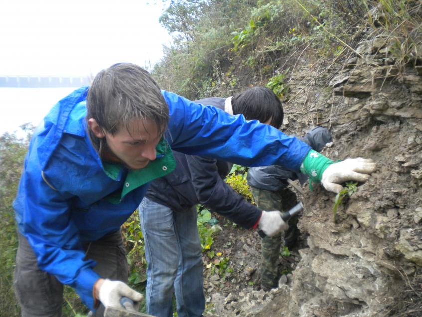 Наконец, когда у дождя лопнуло терпение, и он почти перестал лить, полезли наверх. Нарушая технику безопасности: отсутствие опоры на три точки — руки заняты образцами и молотками; гуськом друг под другом; без страховочного троса.
