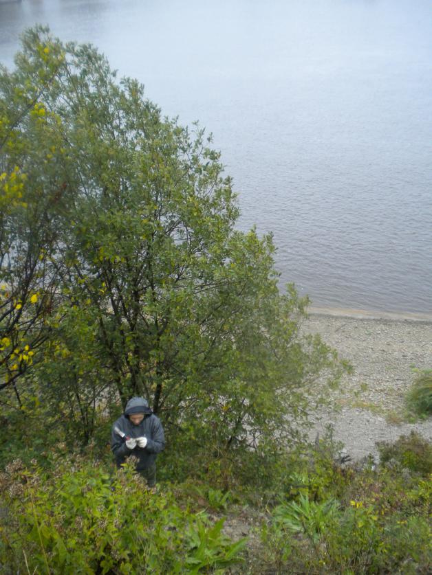 Левый берег реки Волхов в районе ГЭС посетили на следующий день. Постоянно шёл дождь, то моросящий, то проливной. Коренное обнажение расположилось на крутом склоне. На глаз высота склона составляет до 80 м.
