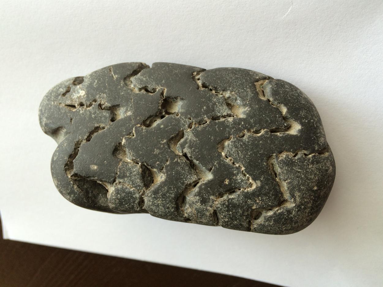 Например, так: в породе была плойчатость, потом обломок породы Японское море окатало, и образовалась такая галька.
