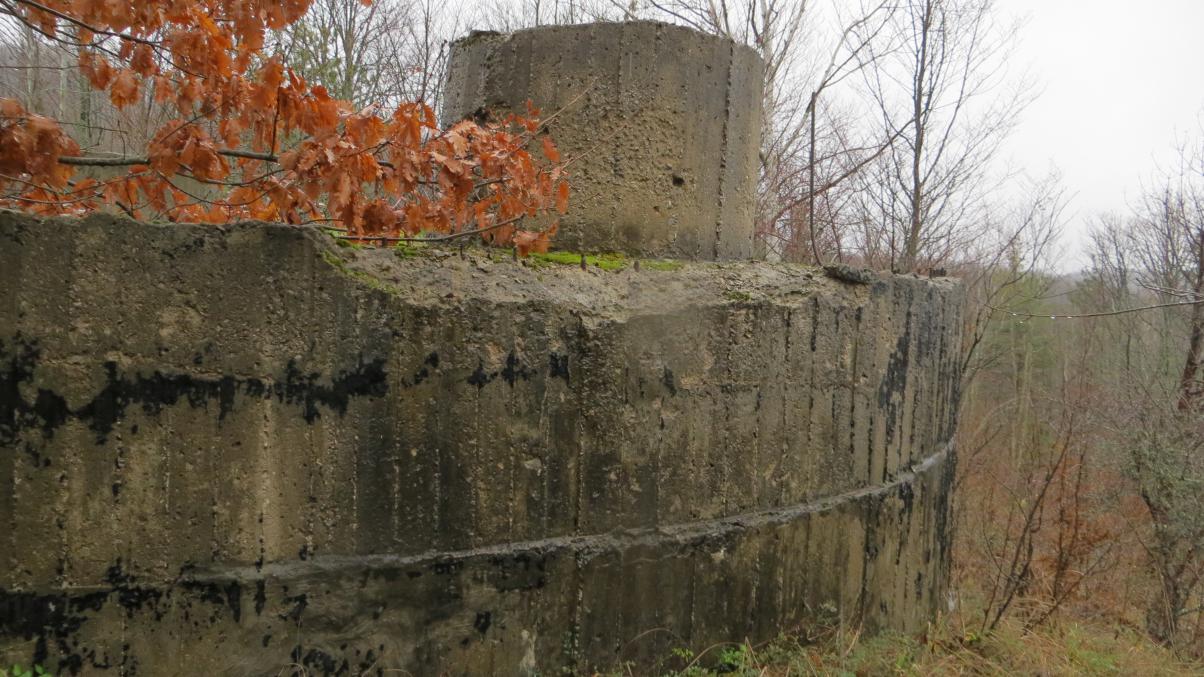 По всей видимости "бункер" каким-то образом функционально связан со штольней, которую я описывал ранее. Он находится выше на горе, приблизительно над одним из ответвлений штольни. Другого смысла в его предназначении я не вижу... Заглянули в бетонный колодец, но там вода. Видимо, накопилась от осадков. Во внутрь не лазали))) Мне кажется, его функция — то ли подача воздуха, то ли подача воды в штольню. На вертикальную часть ствола шахты не похоже...