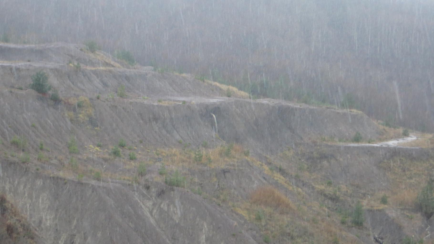 Накапливающаяся после дождя вода собирается в мелкие ручейки, которые сливаясь образуют более крупные потоки. Крупные ручьи уже устремляются вниз в долину, вырезая на склонах карьера глубокие промоины. Местами видны небольшие водопады.
