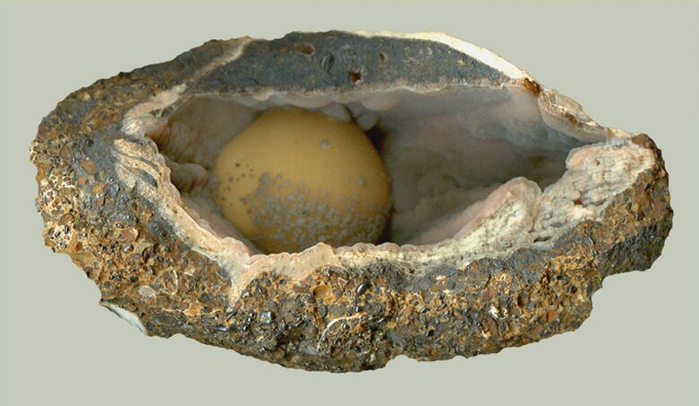 Подскажите, пожалуйста, что за сферическое образование во фрагменте морской раковины? И насколько это редкое явление? Образец найден на Керченском полуострове, на дне морского карьера. Размер овала 35х45 мм.