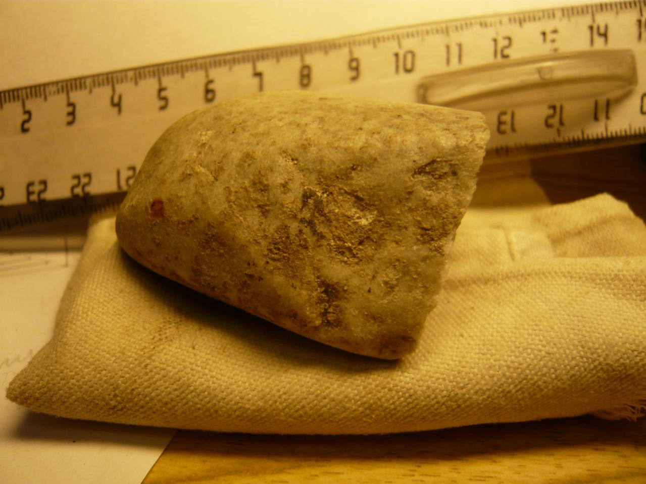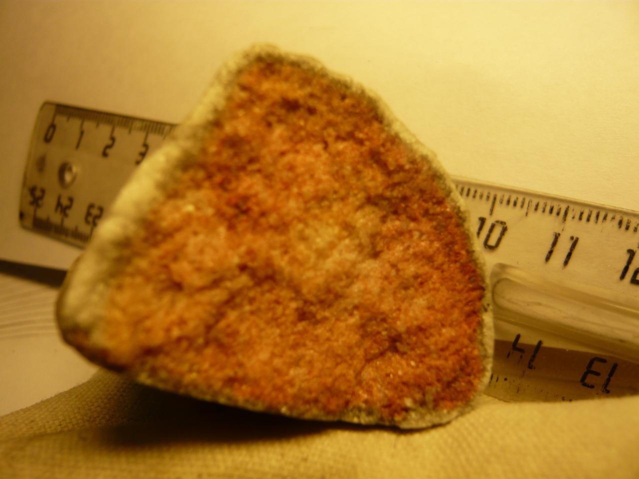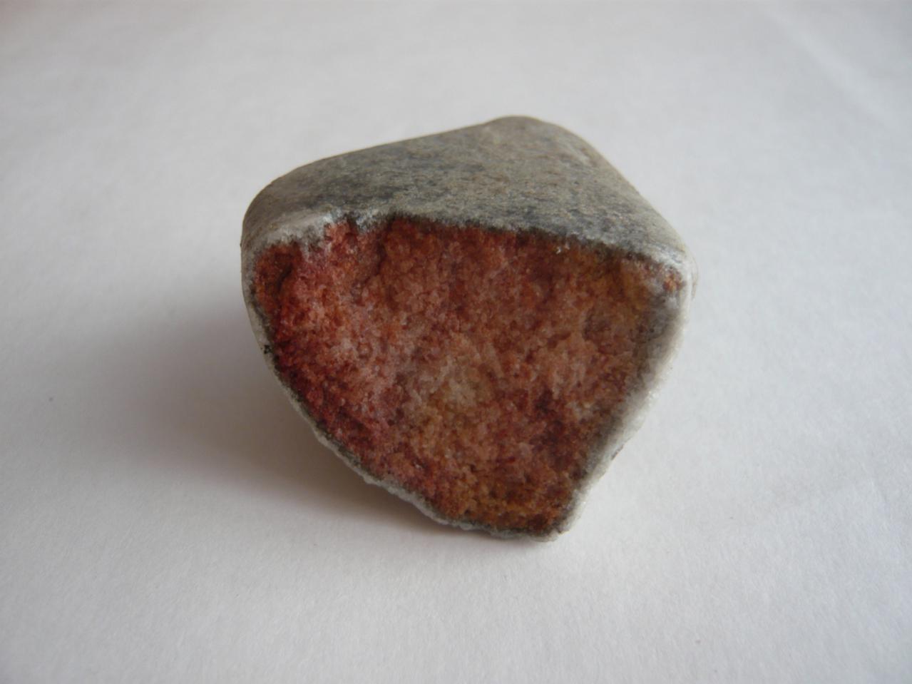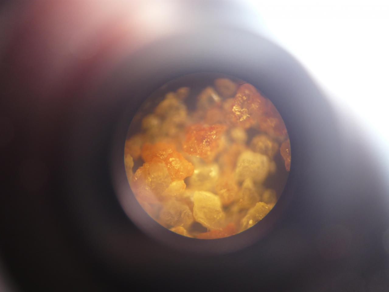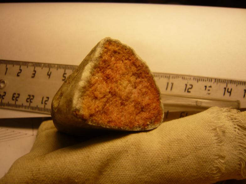 Этот минерал я нашёл на реке Томь в Томской области. Здесь я его сфотографировал через микроскоп и в реальную величину. Твёрдость 4 -5, оболочка и содержимое в виде мелких сросшихся кристаллов. Оболочка белая, а содержимое оранжевое и коричневое. С соляной кислотой не реагирует. Прошу высказывать версии.