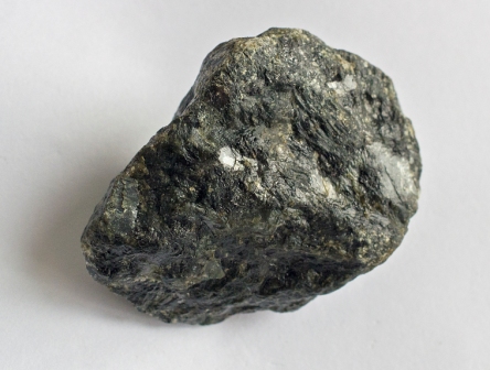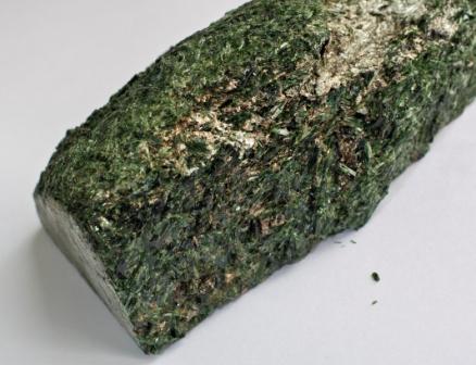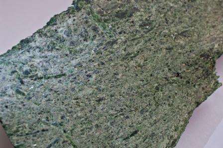 Этот кусок (17 см длиной и 8 см максимальной шириной) — обрезок от большого образца, который попутным ветром занесло в наши края с Урала. Структура кристаллическая, игольчатая. Стекло не царапает. Хрупкий.