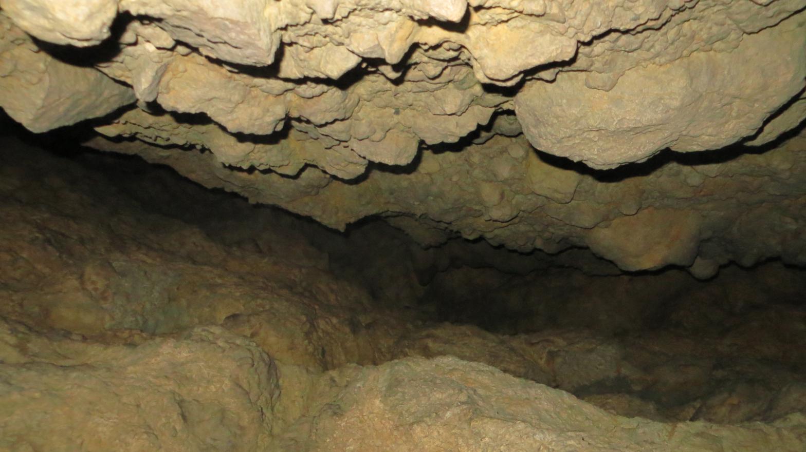 В некоторых местах пещеры встречаются небольшие образования плесени-грибка жёлтого цвета (см. на втором фото). Интересно, что стало питательной средой для его образования, и откуда взялись там на глубине его споры?