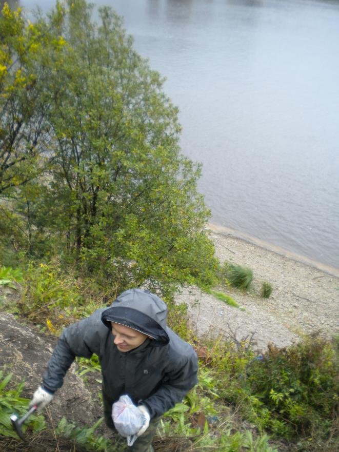 Наконец, когда у дождя лопнуло терпение, и он почти перестал лить, полезли наверх. Нарушая технику безопасности: отсутствие опоры на три точки — руки заняты образцами и молотками; гуськом друг под другом; без страховочного троса.