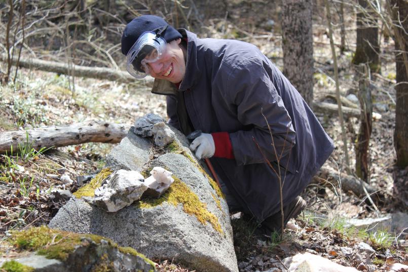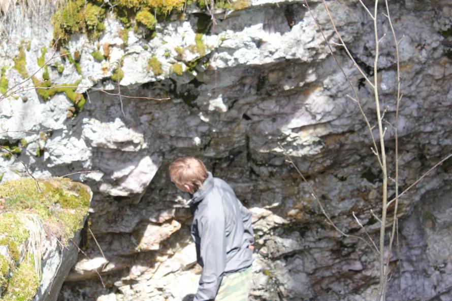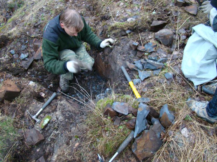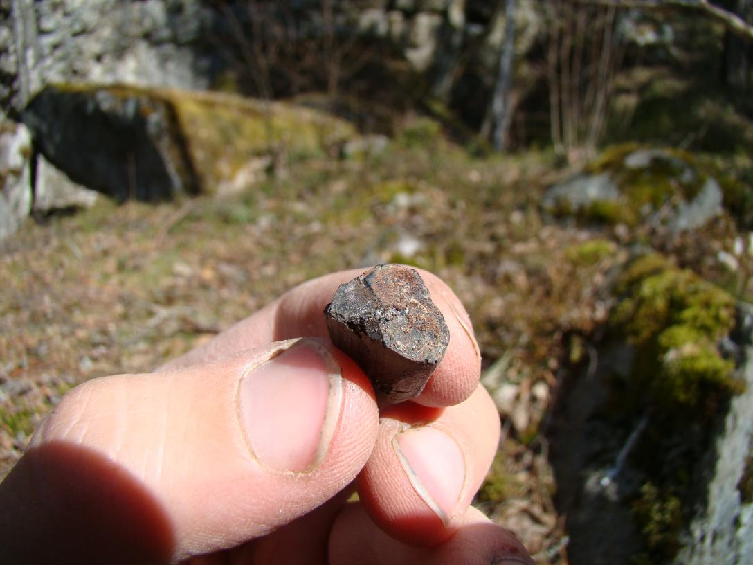 Следующим по плану пунктом были Сортавалитовые стёкла с острова Риеккалансаари. Они приурочены к контакту (зоне закалки) между габбро-долеритовой дайкой и гнейсами. Мощность этого контакта варьирует от 0.5 до 4 см, нам удалось обнаружить контакт около 1 см. Породы сильно затронуты выветриванием, извлекать сортавалитовые стёкла было довольно сложно, потому что они буквально рассыпались на глазах.