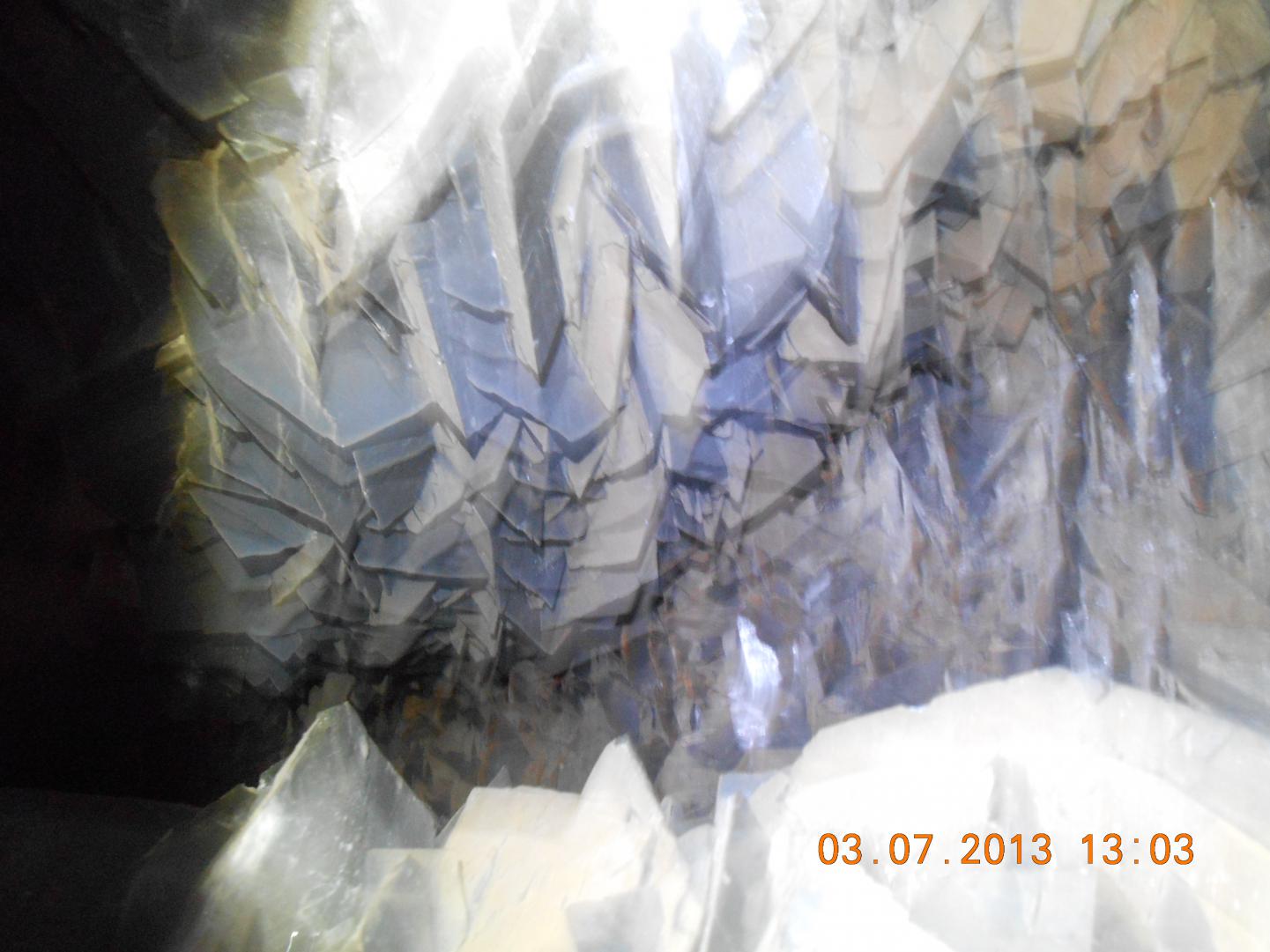 И вот слева кальцитовый "дутыш" — зрелище потрясающее, но сильно обезображенное варварами, мародёрами и браконьерами от геологии... Зачем портить такую красоту? Выламывать, выпиливать кристаллы кальцита, это же не драгоценный камень, а всего лишь карбонат кальция. Очень жалко. Прямо разочарован. Туда бы металлическую решётку приварить, чтобы не лазали, а только смотрели, ведь по сути дела — это памятник природы. Кстати, если аккуратно поковырять утоптанный грунт в проходе дутыша, то наверняка вы там найдёте несколько образцов себе в коллекцию. Мы для этого использовали маленький металлический совок-лопатку.
