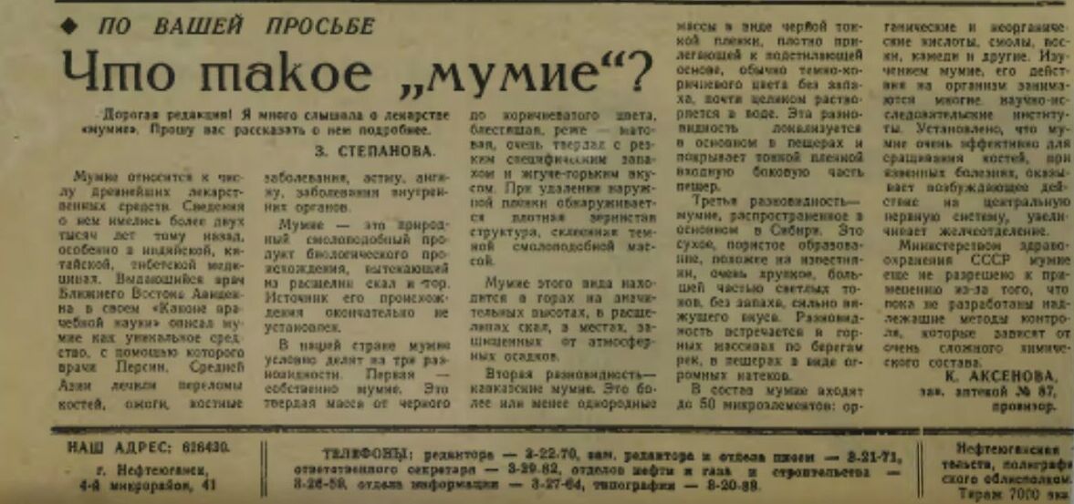 Во вложении вырезка из газеты Нефтеюганский рабочий от 7 января 1978 года. Провизор аптеки демонстрирует хорошую осведомлённость о мумиё. Похоже, им втихаря лечили, хотя официально оно и не было разрешено к применению.