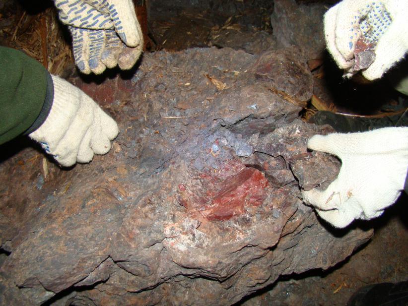 Нет, это не красная стеклянная голова. Я взял кусочек, потом на поверхности посмотрел. Вроде, это обогащённый окисленным гематитом доломит. Точно уже не помню, образец оставил около штольни. Может не доломит, а какая-то другая порода, могу ошибиться.