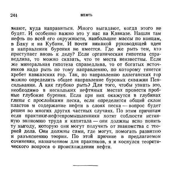 …если практики-нефтепромышленники хотят соблюсти истинную экономию труда и капитала — они должны ясно понять ту выгоду, которую они могут получить от знакомства с теорией дела. Они должны сами, где могут, помогать развитию и разъяснению теории. По этой причине в предлагаемом сочинении, назначенном для практиков, я и коснулся теоретического вопроса о происхождении нефти”.