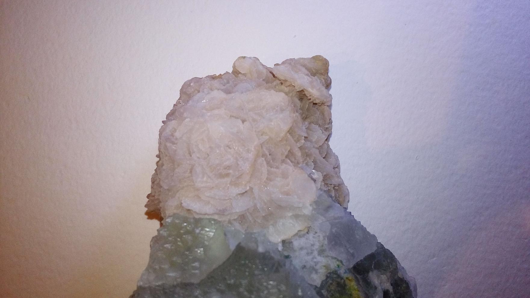 У зеленоватого камня шероховатая поверхность. С одной стороны, которая находится постоянно в тени, бугорки маленькие, а та сторона что повернута к солнцу, имеет бугры побольше и поострее. Их форма напоминает конус. Сам камень не сильно прозрачный (мутный). Про приросший к нему белый камень ничего толком не могу сказать. Только то, что состоит он как бы из пластин. Те, которые обведены в красный круг, выросли совсем недавно и продолжают понемногу расти. Описать я их могу только как: белые, мутные, вытянутой формы. Надеюсь, что это как-то поможет.